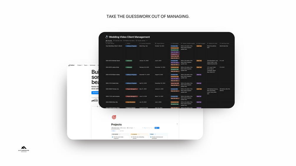 With this template, you'll get a complete system to manage your wedding videography projects, deadlines, and client details efficiently.